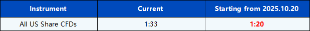 Please be advised that the leverage on all US Share CFDs products will be adjusted from 20 October 2025 to further optimise the competitiveness and improve the trading environment.
