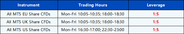 During these specific trading hours, MT5 Shares CFDs products leverage is fixed at 1:5 and additional margin is required to open any new positions. Once holding positions are no longer within the specified trading hours, the leverage will automatically restore to 1:20.