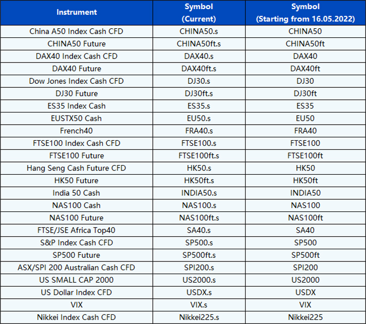 Please be advised that PU Prime is removing the suffix on Indices CFDs products from 16th May 2022. This would make it easier for clients to identify our Indices products on Market Watch thus improving clients’ experience.