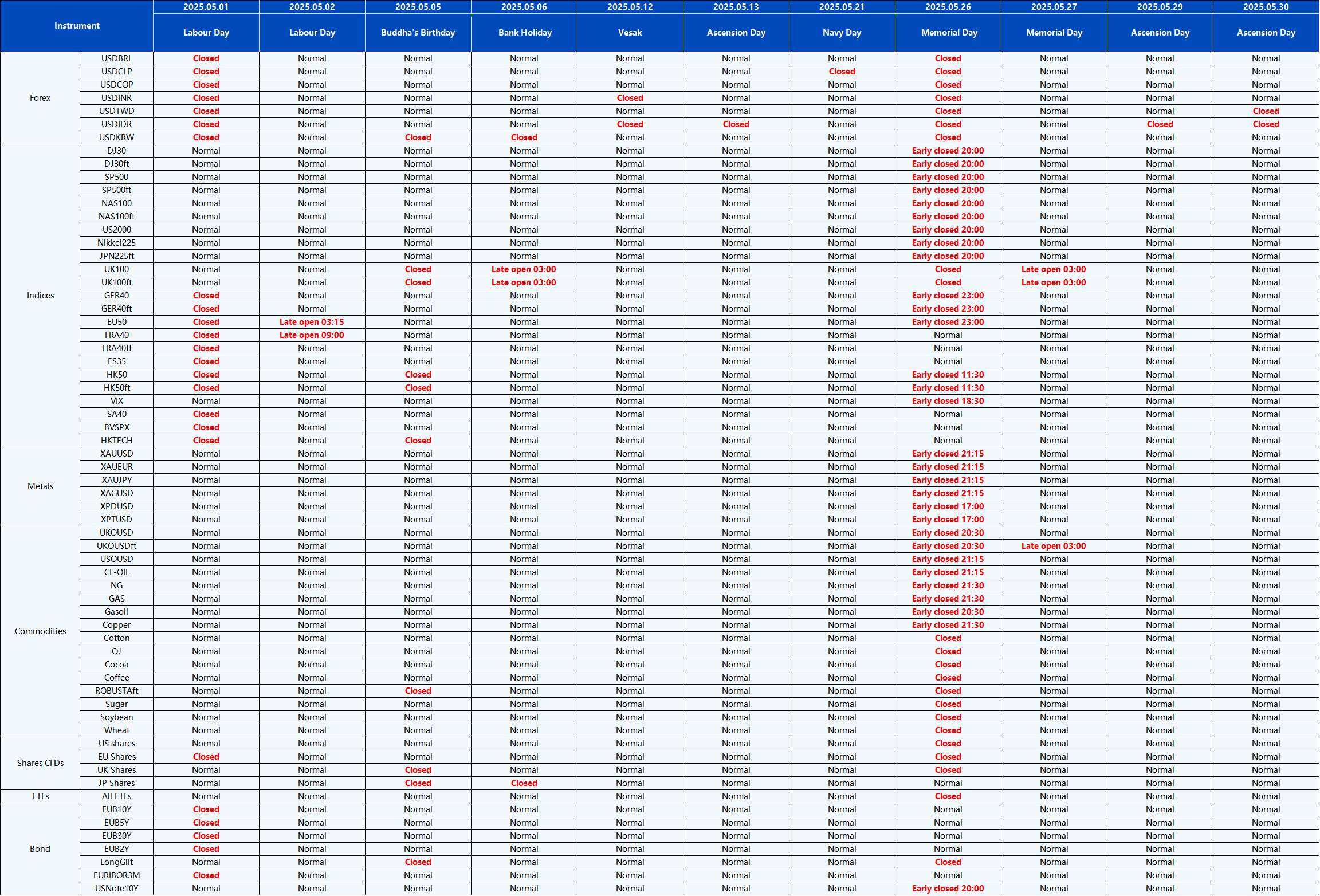 Please be advised that the following instruments’ trading hours and market session times will be affected by the upcoming May holidays.